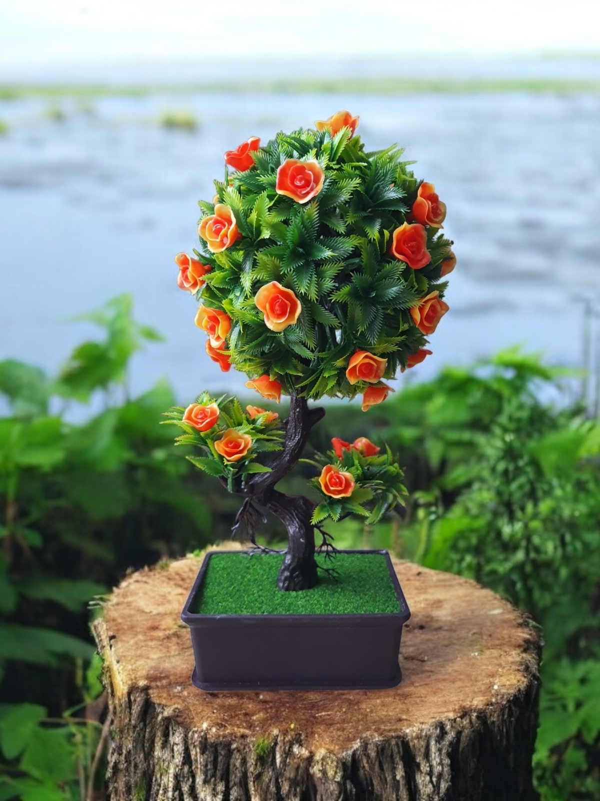 Plantele decorative artificiale reprezintă o modalitate eficientă de a înfrumuseța și a crea un ambient plăcut in orice încăpere. Bonsai artificial cu flori portocalii 28 cm este prevăzut cu frunze cu detalii perfecte, bucurându-se de un aspect realist care nu se va ofili niciodată. Astfel, este ușor de amplasat și de integrat în diverse stiluri de decor. Poate fi folosit ca piesă centrală într-un aranjament floral sau poate completa o colț de relaxare. Astfel, va oferi o senzație de natură în interiorul unei locuințe sau birouri. Este perfect pentru cei care apreciază aspectul plantelor, dar nu au timpul sau abilitățile necesare pentru a îngriji plante reale.