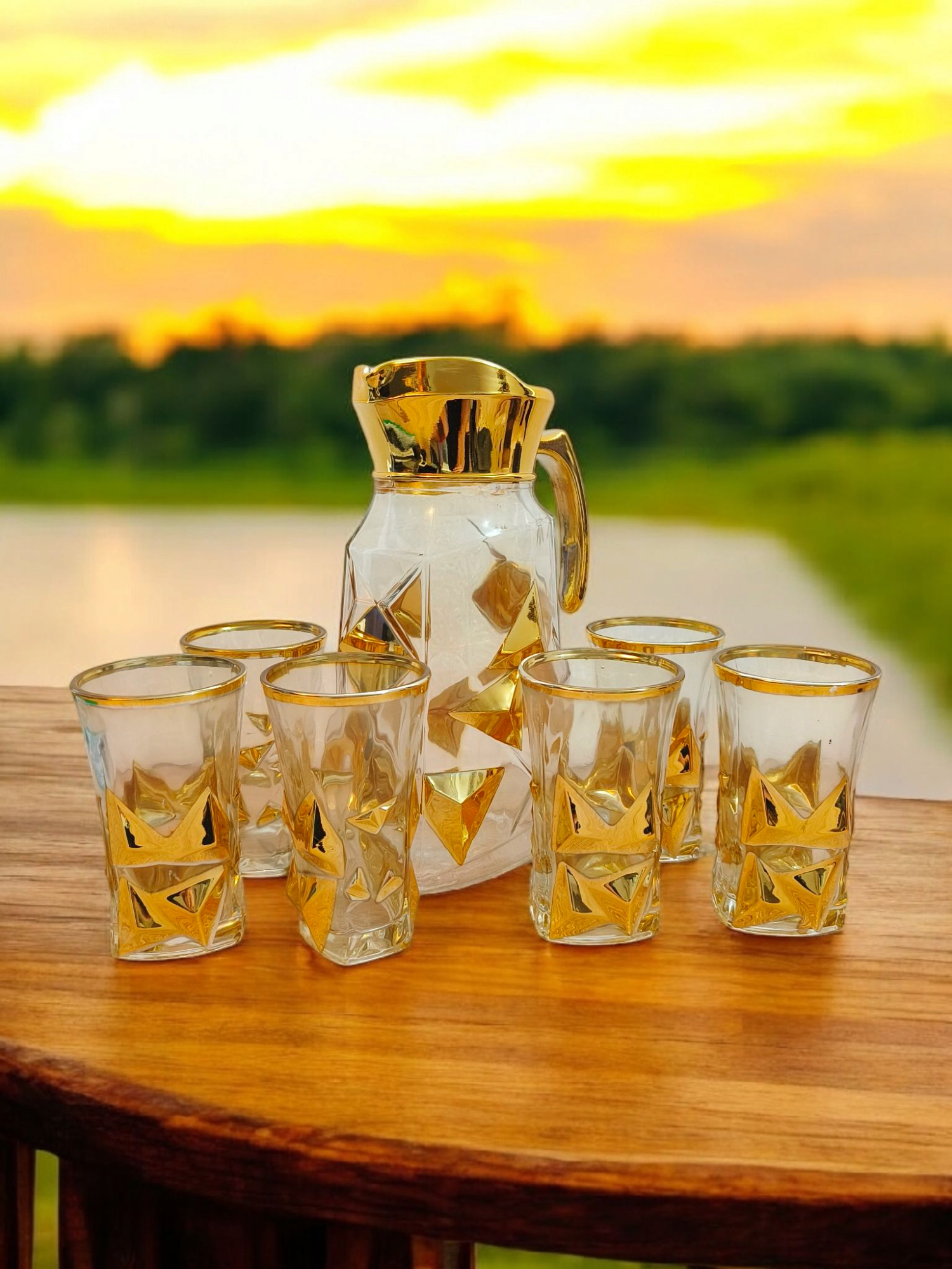 Carafă aurie cu 6 pahare din sticlă, design rafinat pentru orice ocazie
