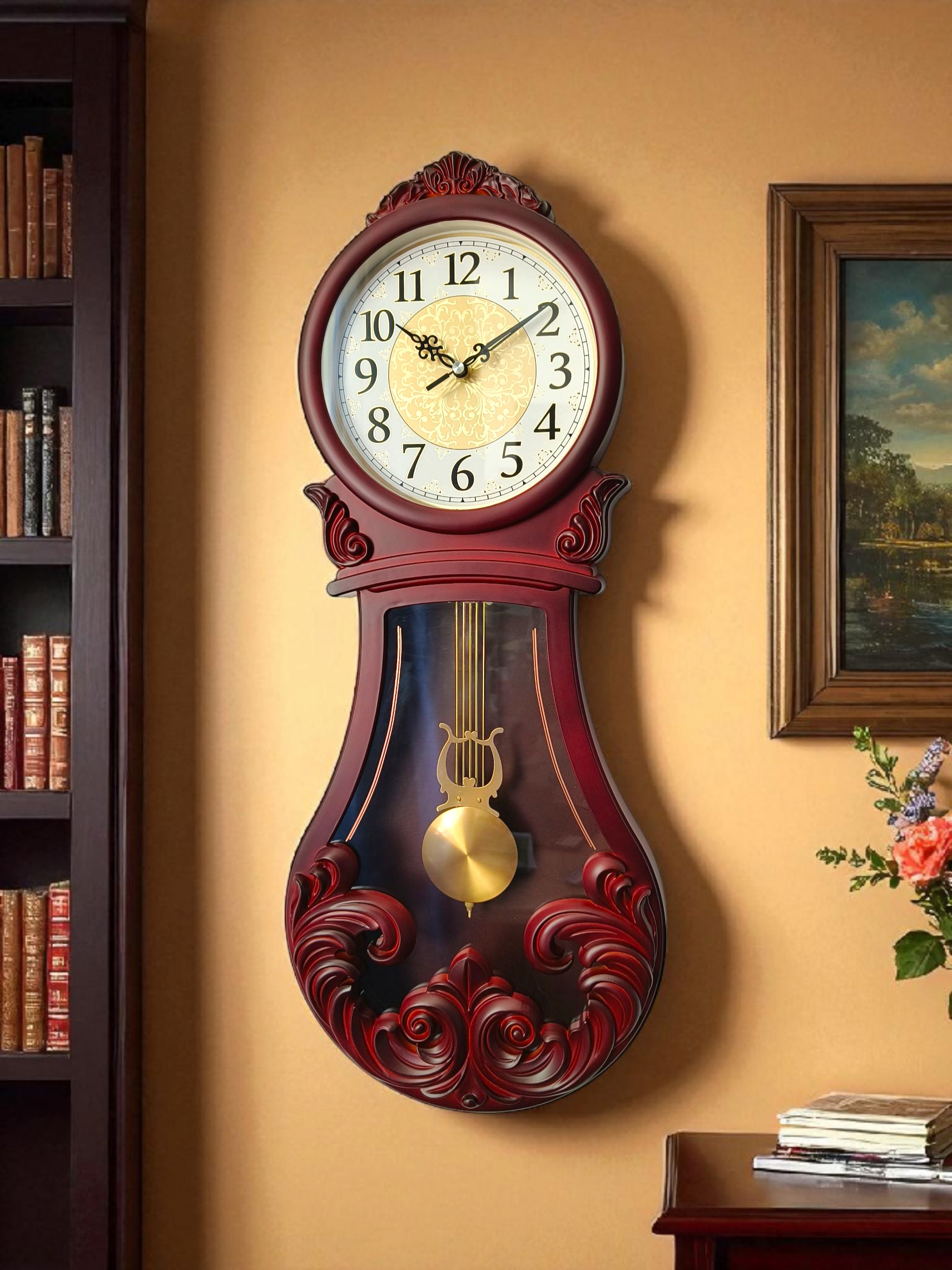 Acest ceas de perete roșu închis lucios cu pendul 68 cm , finisat într-un roșu închis lucios, îmbină armonios designul clasic cu eleganța vintage. Având o înălțime de 68 cm și o formă grațioasă de liră, devine piesa de rezistență a oricărui perete. Ornamentele decorative lucrate și pendulul central auriu strălucitor îi conferă un rafinament de epocă, evocând farmecul ceasurilor retro de altădată.