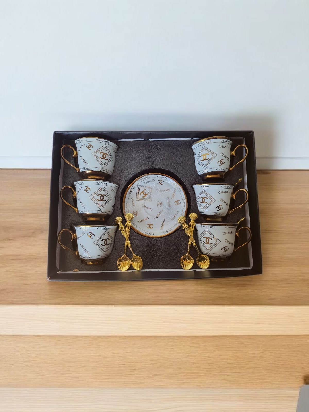 Descoperă eleganța clasică și rafinamentul unei dimineți perfecte cu acest serviciu de cafea, compus din 6 cești de cafea, 6 farfurioare și 6 lingurițe aurii. Ideal pentru momentele speciale alături de familie sau prieteni. Acest set este alegerea perfectă pentru cei care apreciază detaliile fine și calitatea superioară.
