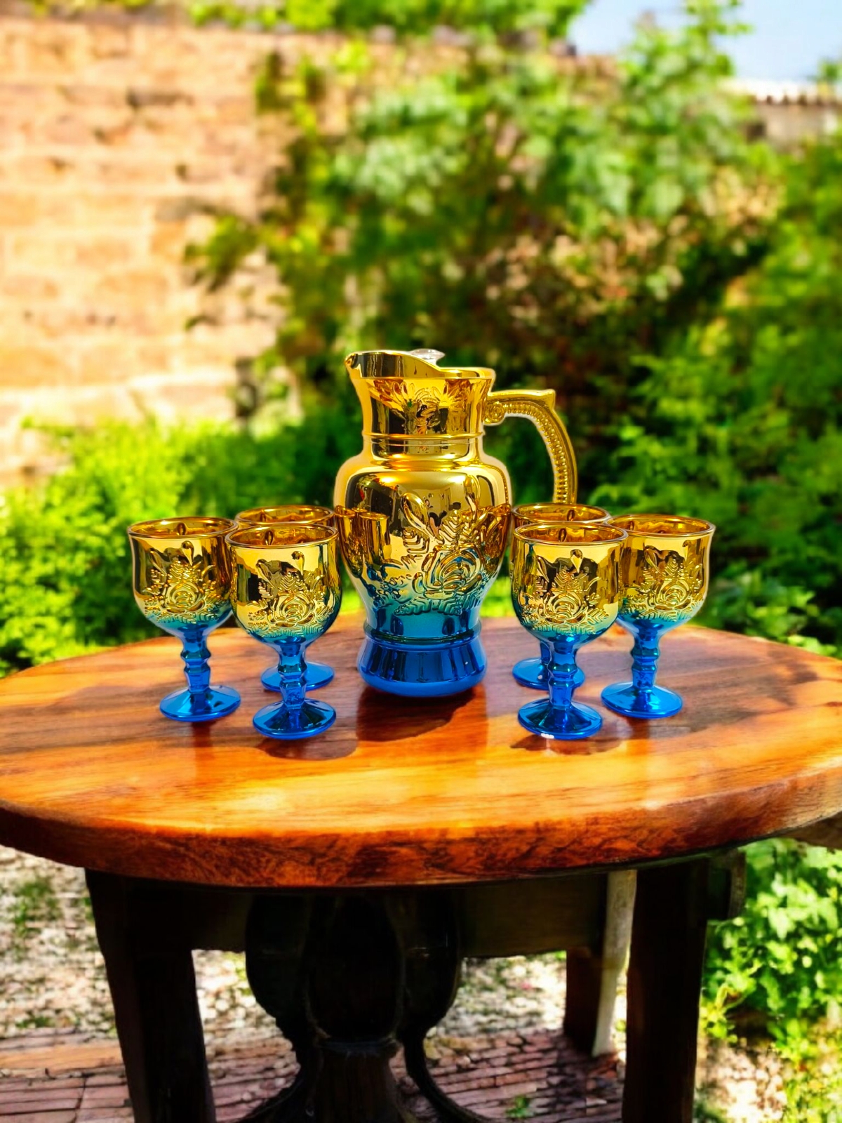 Completează-ți masa cu eleganță și rafinament cu acest set carafă aurie și 6 pahare sticlă, ideal pentru acasă, restaurante sau hoteluri. Acest set conține o carafă capacitate 2 litri și 6 pahare de 180 ml. Setul este perfecte pentru servirea apei, sucurilor, limonadei sau altor băuturi preferate.