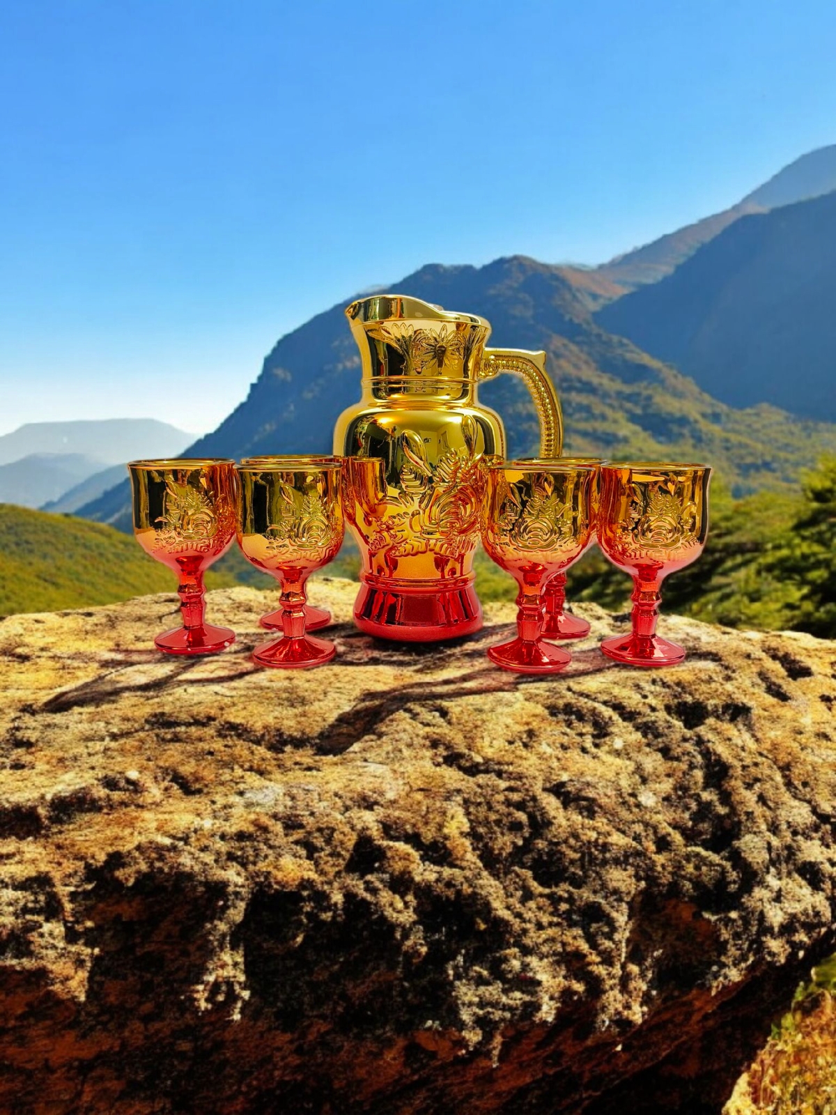 Completează-ți masa cu eleganță și rafinament cu acest set carafă aurie și 6 pahare sticlă, ideal pentru acasă, restaurante sau hoteluri. Acest set conține o carafă capacitate 2 litri și 6 pahare de 180 ml. Setul este perfecte pentru servirea apei, sucurilor, limonadei sau altor băuturi preferate.