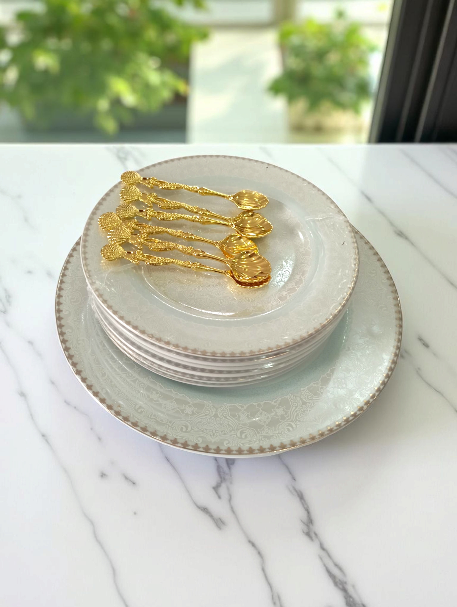 Completează-ți masa cu un plus de rafinament și stil natural cu acest set modern din porțelan fin cu lingurițe aurii vintage.