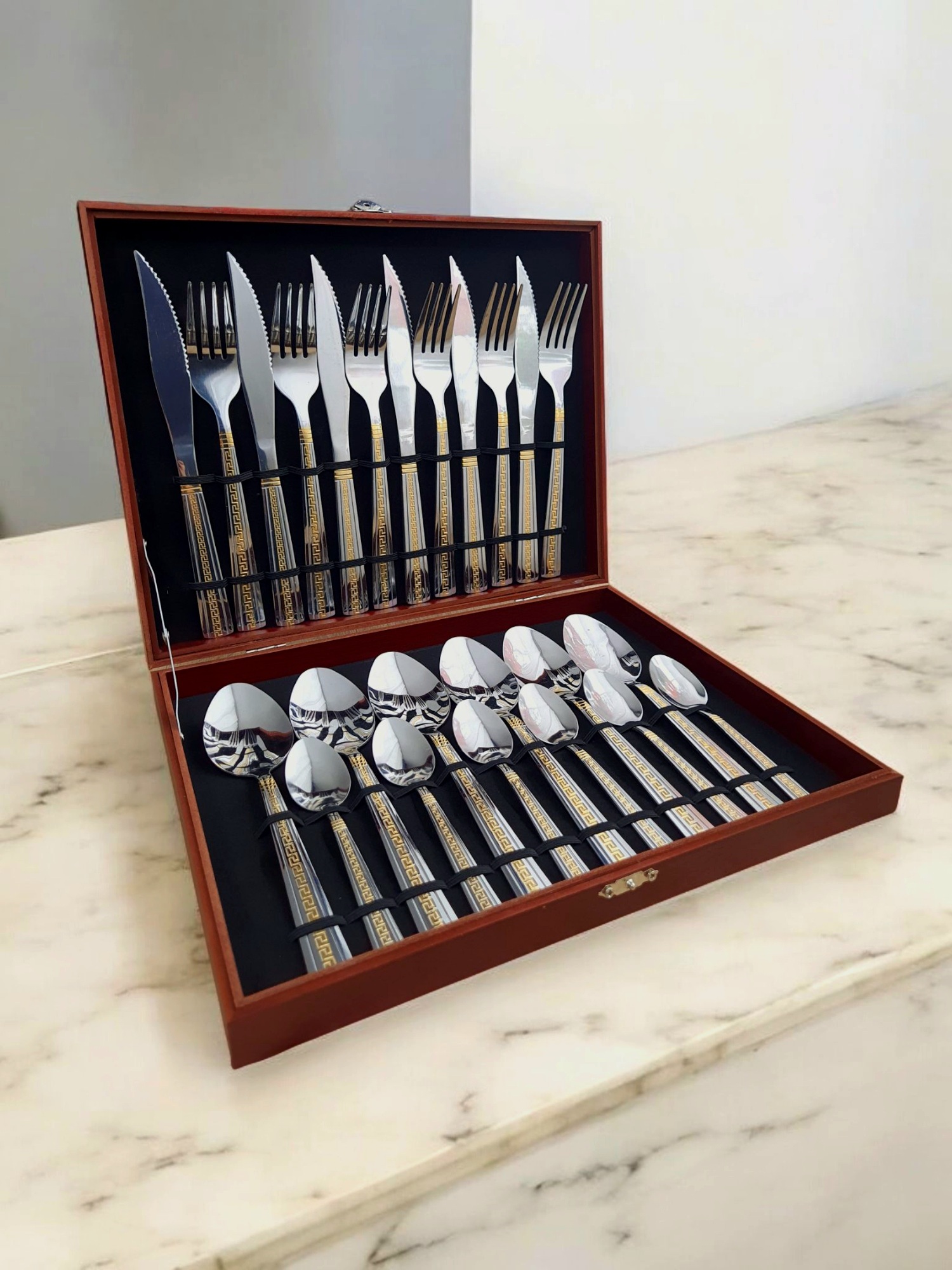 Acest set de tacâmuri impresionează prin finisajele de înaltă calitate și modelul elegant cu detalii aurii. Mânerele sunt decorate cu un motiv clasic, inspirat din stilul aristocratic, oferindu-i un aspect rafinat și atemporal. Datorită designului sofisticat, setul se potrivește perfect în orice bucătărie modernă sau clasică, adăugând un plus de stil mesei tale.